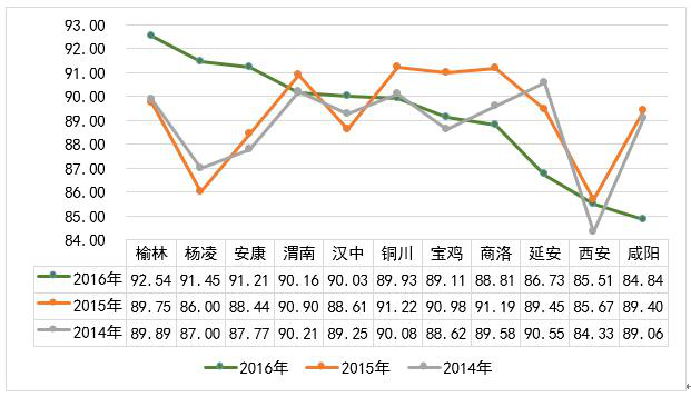Ø 近三年陜西省各地市公眾氣象服務滿意度對比分析